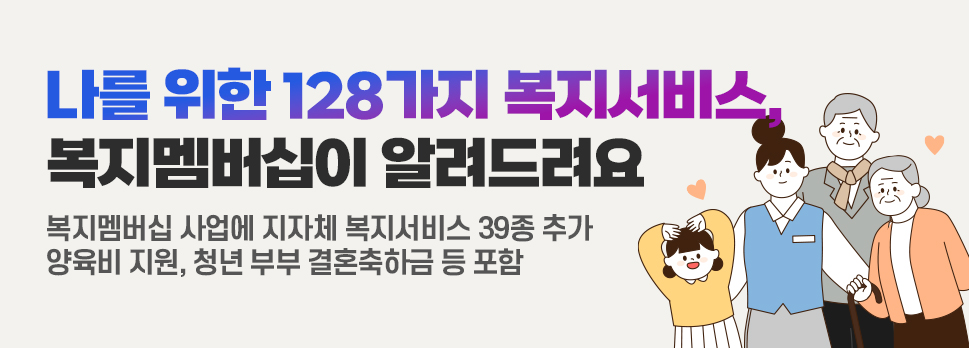 - 복지멤버십 안내 사업에 지방자치단체 복지서비스 39종 추가-- 양육비 지원, 청년 부부 결혼축하금 등 청·장년층 대상 복지서비스 다수 포함 - 보건복지부(장관 조규홍)는 2024년 12월부터 맞춤형 급여 안내(‘복지멤버십’) 가입자 대상으로 지방자치단체가 자체적으로 실시하는 39종의 복지서비스를 추가로 안내한다고 밝혔다. 복지멤버십은 가입자의 소득ㆍ재산 등을 분석하여 국민이 받을 수 있는 복지서비스를 맞춤형으로 안내하는 제도로, 현재 83종의 중앙부처 복지서비스와 6종의 서울특별시 복지서비스를 안내 중이다. 이번에 복지멤버십 안내 사업에 추가되는 복지서비스에는 ▲저소득층 자녀교육비 지원사업(충남) ▲장애인활동지원 시비추가지원사업(울산) 등 취약계층 대상 복지서비스뿐만 아니라 임산부 우대금리 ..